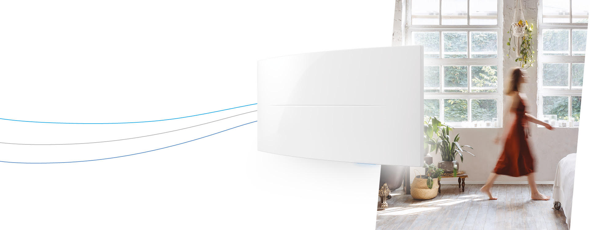 Sistema di ventilazione meccanica controllata a doppio flusso per il ricambio automatico dell’aria con recupero di calore fino al 91% continuo. Minimale e silenzioso, misura 695x353x152 mm. Ideale per la depurazione dell’aria di salotti e open space.