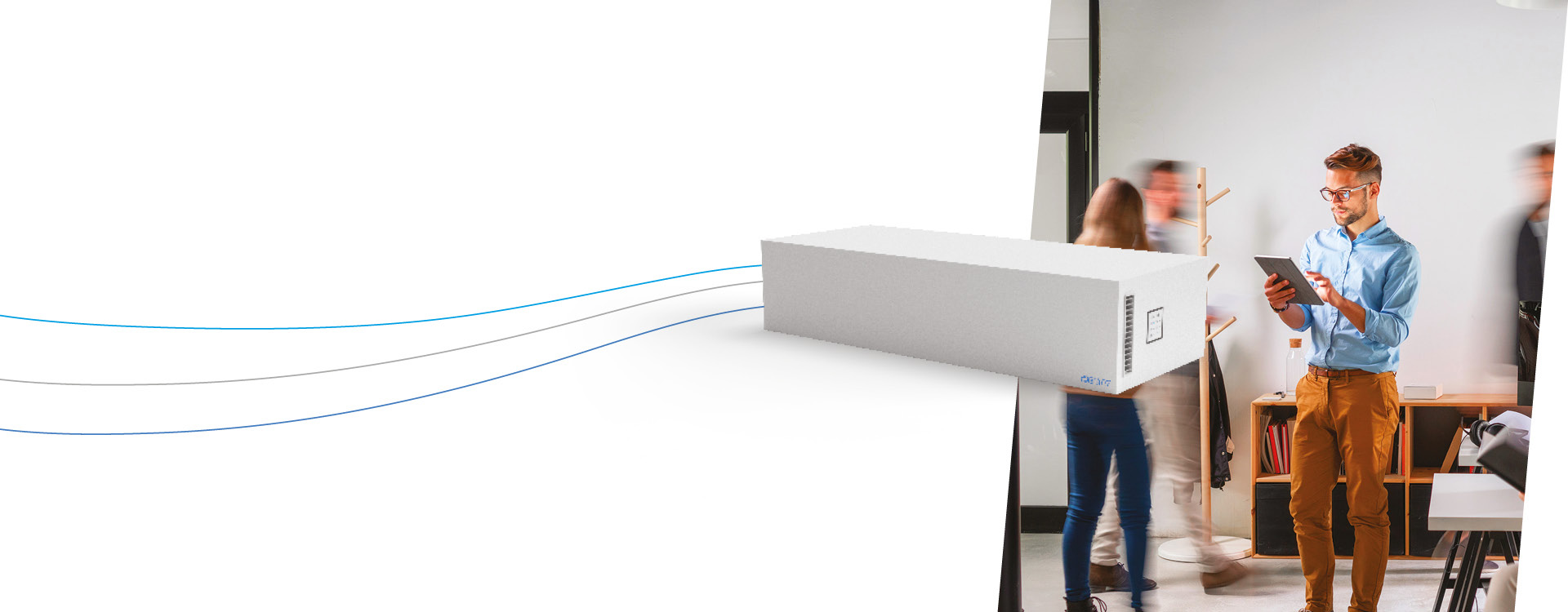 Ridotto al minimo l’impatto interno: un piccolo diffusore bianco, di dimensioni particolarmente compatte e dal design minimal, gestisce l’immissione e l’estrazione continua e bilanciata dei flussi d’aria in ambiente indoor.